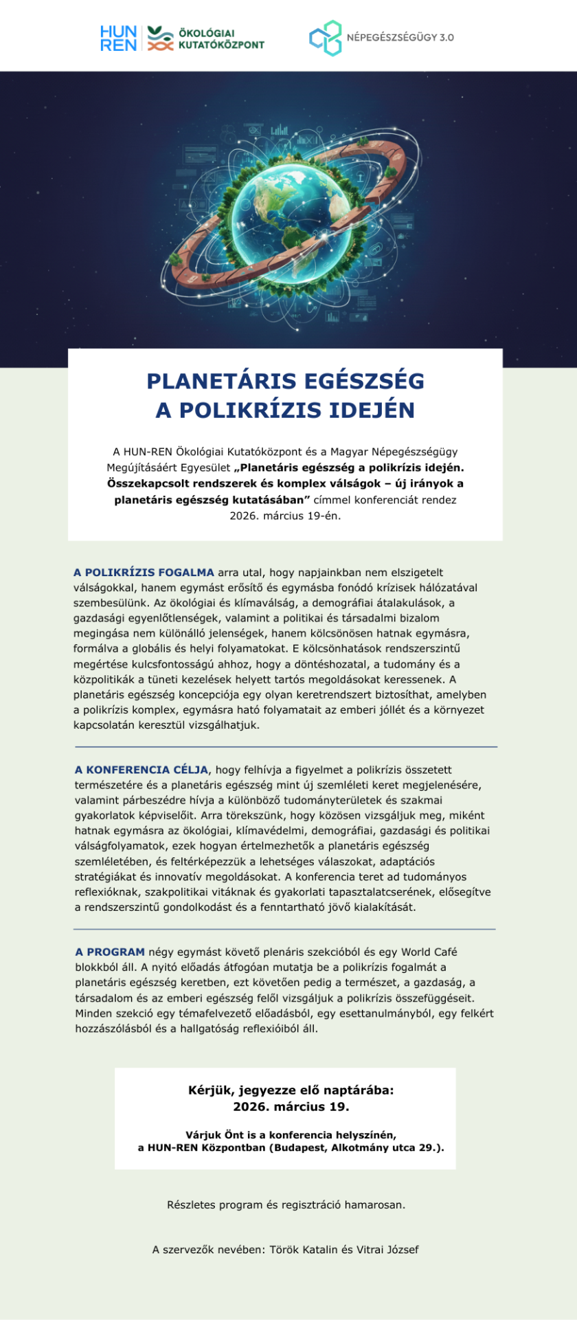 A HUN-REN Ökológiai Kutatóközpont, csoportunk közreműködésével, és a Magyar Népegészségügy Megújításáért Egyesület "Planetáris egészség a polikrízis idején. Összekapcsolt rendszerek és komplex válságok – új irányok a planetáris egészség kutatásában" címmel konferenciát rendez 2026. március 19-én.