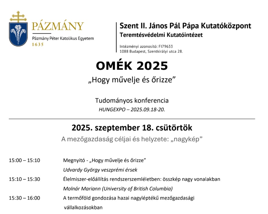 2025. szeptember 18-20-ig kerül megrendezésre az OMÉK szakmai programjának részeként a címben említett tudományos konferencia, melynek célja, hogy a tudomány képviselői, a gyakorlati szakemberek és a döntéshozók párbeszédet folytassanak a mezőgazdaság, az élelmiszer-ellátás és a természeti erőforrásokkal való gazdálkodás jövőjéről.